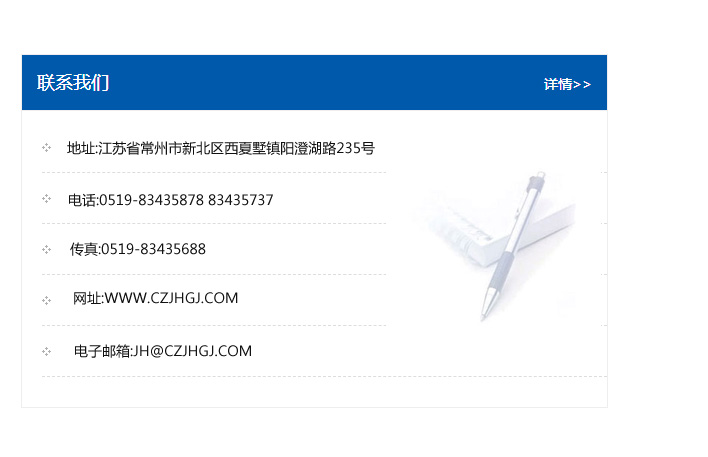 地址:常州市新北區友邦商務大廈1幢16、17層  電話:0519-85101652  傳真:0519-85112595  郵編:213022  網址:www.cz-jiayue_cn.wxjazs.com  郵箱:xiajifengaa@163.com